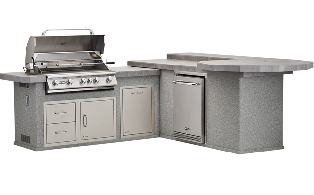 The Supreme Q Raised Bar Concept offers a large counter space as well as an added bar for an unmatched grilling and entertaining experience. This L-shaped outdoor island kitchen with raised bar features a stainless steel gas grill and refrigerator for serving only the best food and drinks to your guests.
