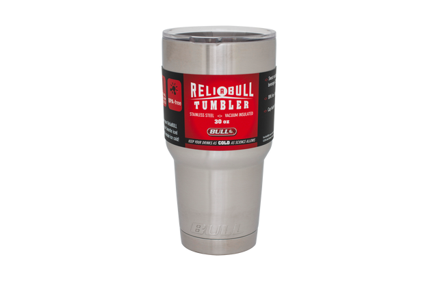 The ReliaBull extra large 30 oz. stainless steel tumbler is Vacuum Insulated and keeps beverages hot or cold for an extremely long amount of time.